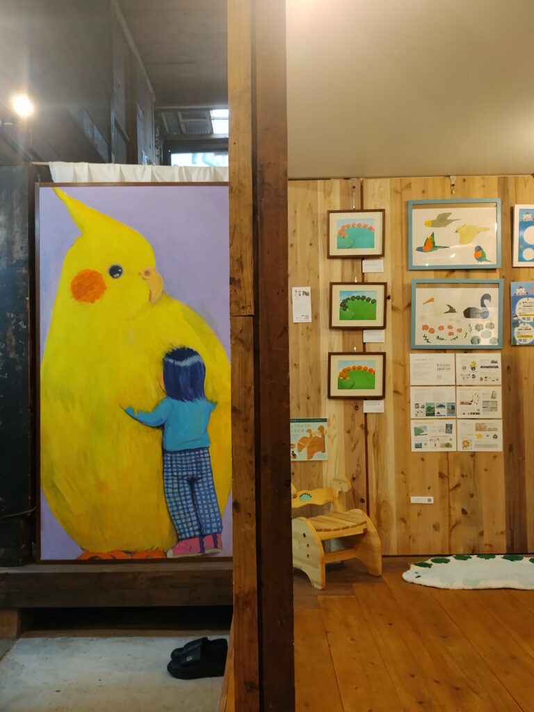 名山CDの展示を今一度観に行く。これまでうっかり靴下なしで来てしまったため、履き替える場所に入りにくかった。ことうのぞみ氏がぞ展に置いていた大きな絵(襖絵とよぶべきか?)がめいざんちの古民家によくマッチしていた。