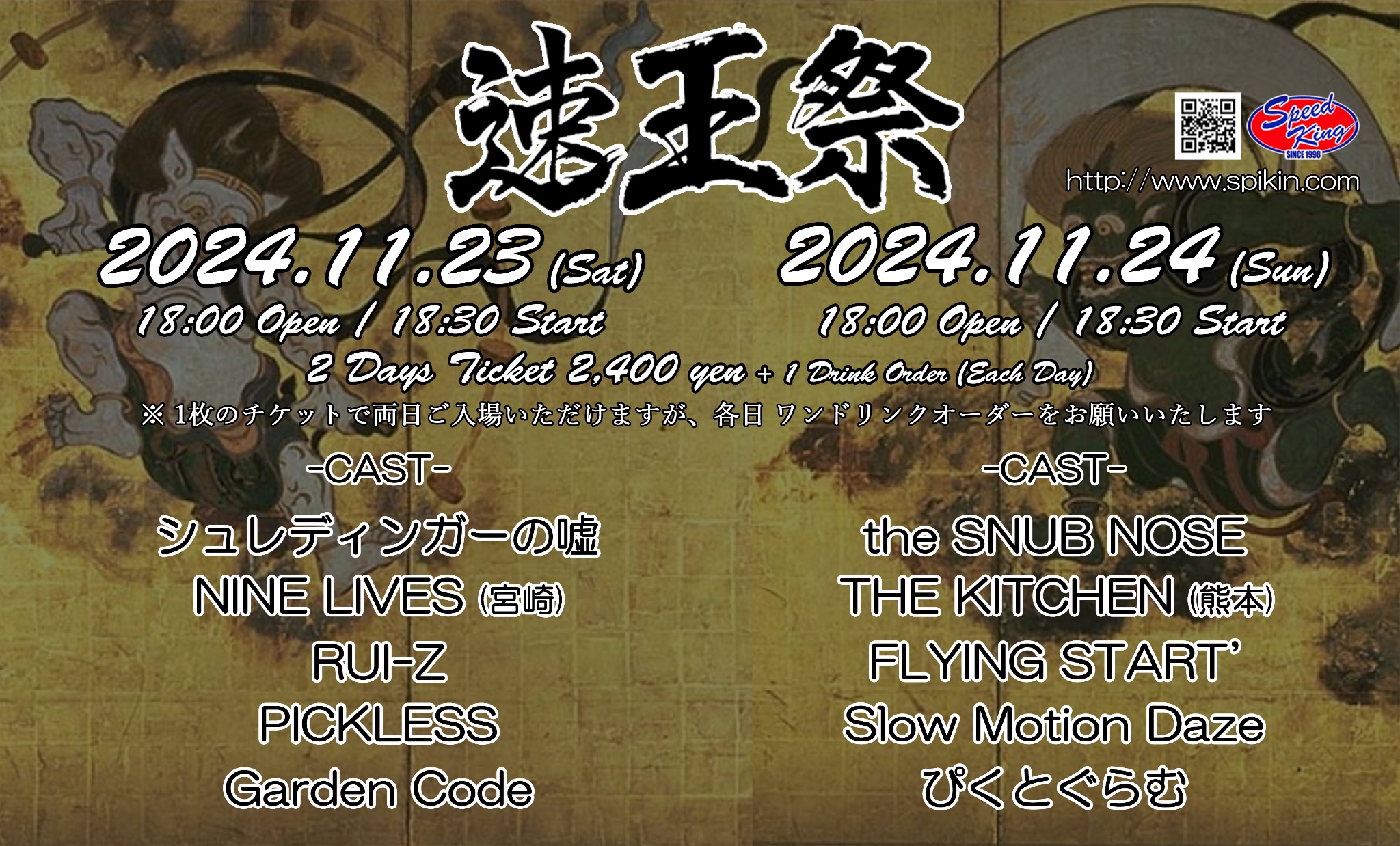 イベント名:速王祭2024日付:2024.11.24とき:op18:00/st18:30場所:鹿児島,天文館Speed King費用:2400円+1D(23日,24日の2日通しチケットのみの販売)出演者(24日出演者):Slow Motio
