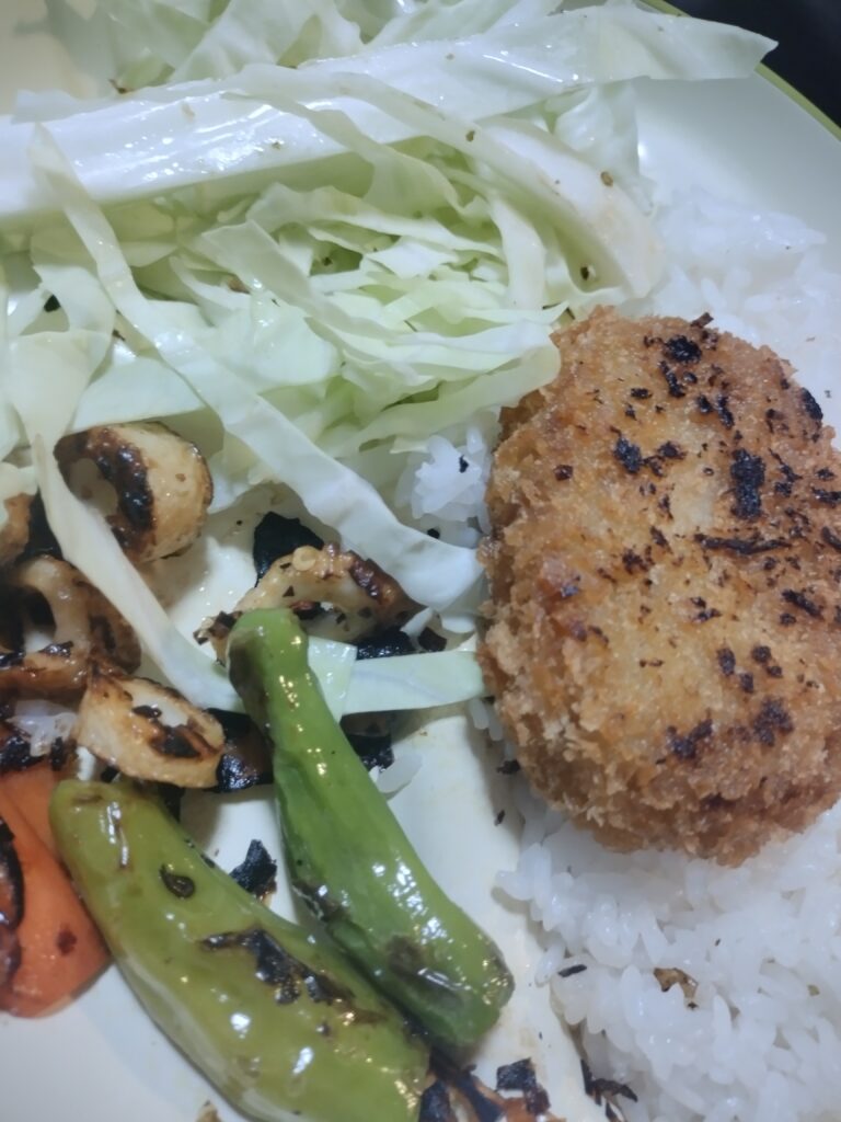 なんかコロッケがある。千切りの生キャベツを添えるとして、あとはパンチのある炒め物がほしい。ししとうがいい食材だった。ヘタを切って軽く切れ込みを入れておくと良いらしい。ニンニクひとかけを油で炒めてニンジンに火を入れる。その後ししとうとちくわをいい感じになるまで炒める。かつお節と和えて、ごま油と醤油と酢をかけて完成。今回はニンニク、ニンジン、かつお節、ちくわ、ししとうの順で入れてしまい、かつお節がとても焦げた。