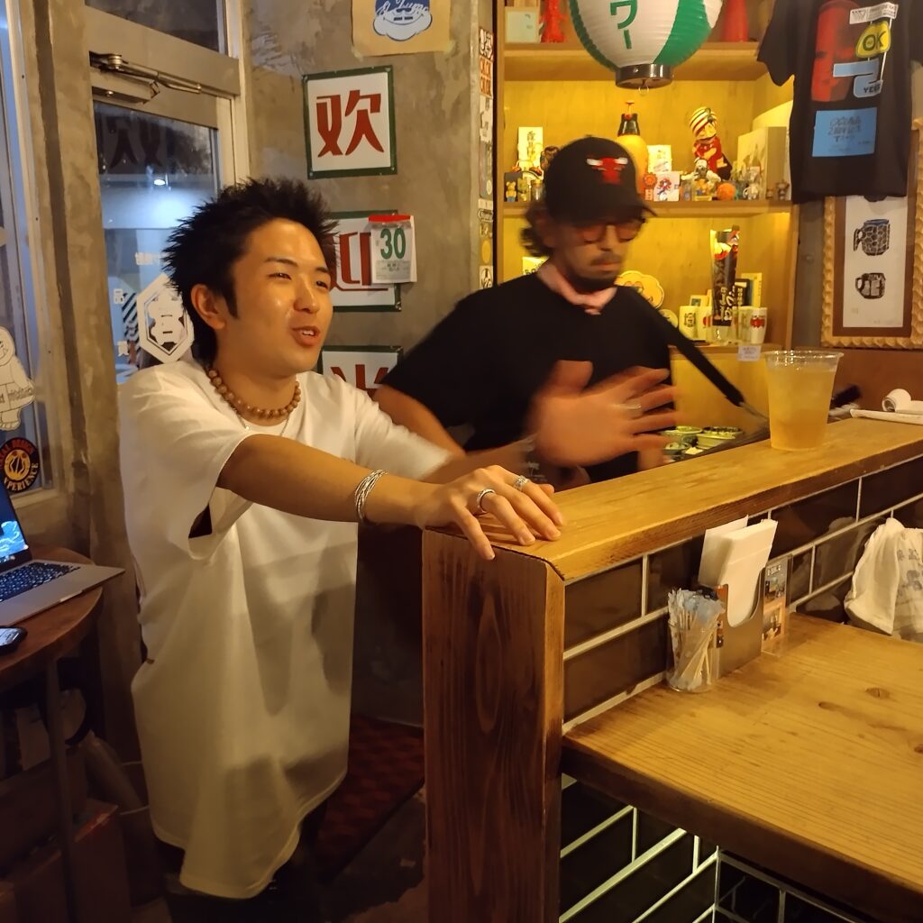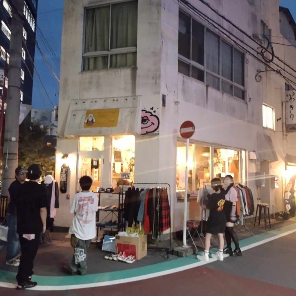 弾き語りは芽衣氏とBACKSKiDのシモン氏、wiθの夏樹氏によって行われた。店先では夏樹氏による古着屋も展開。入り口のちょっとしたスペースでMCと演奏を展開。カウンター側も詰めたら7〜8人入り、外からもゆったり観られる。