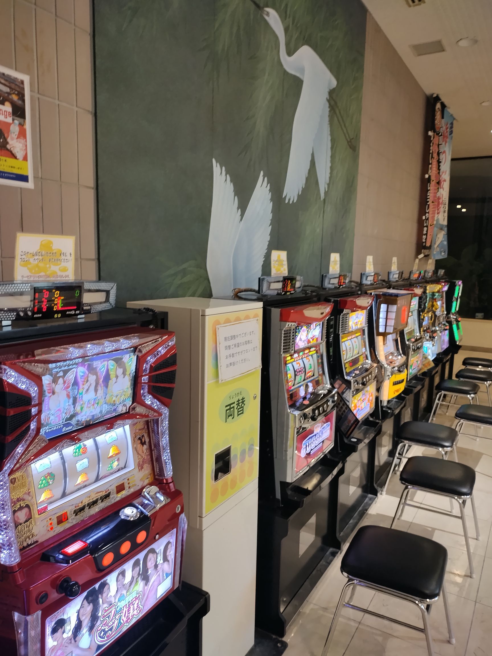 怪しいゲームセンター ハリケーン。スロット機がメイン。さっきホテルで見たのと同じシステムと思われる。スロット分かるんだったら雰囲気もよくて遊べると思うのだが…。