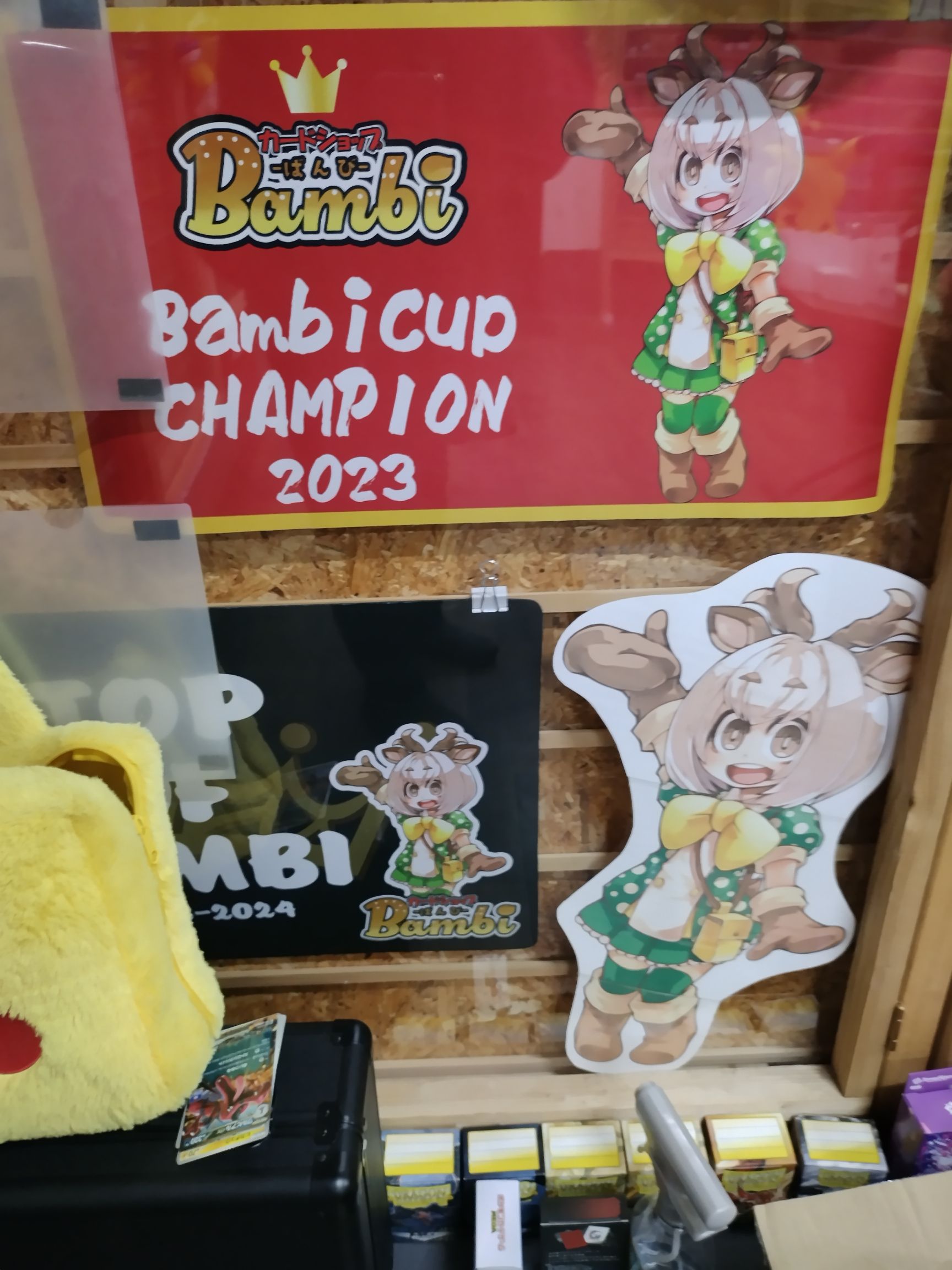 鹿屋のカードショップbambi。店内キャラクターはあやめ氏のデザイン。店内のショーケースは矢鱈とシャリタツ(ポケモン)がフィーチャーされていた。
