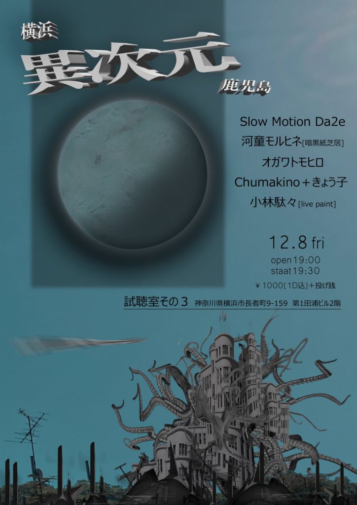 出演者:Slow Motion Da2e(オオノ・ホウブン) / 河童モルヒネ[暗黒紙芝居]/ オガワトモヒロ / Chumakino+きょう子 / 小林駄々[live paint ]