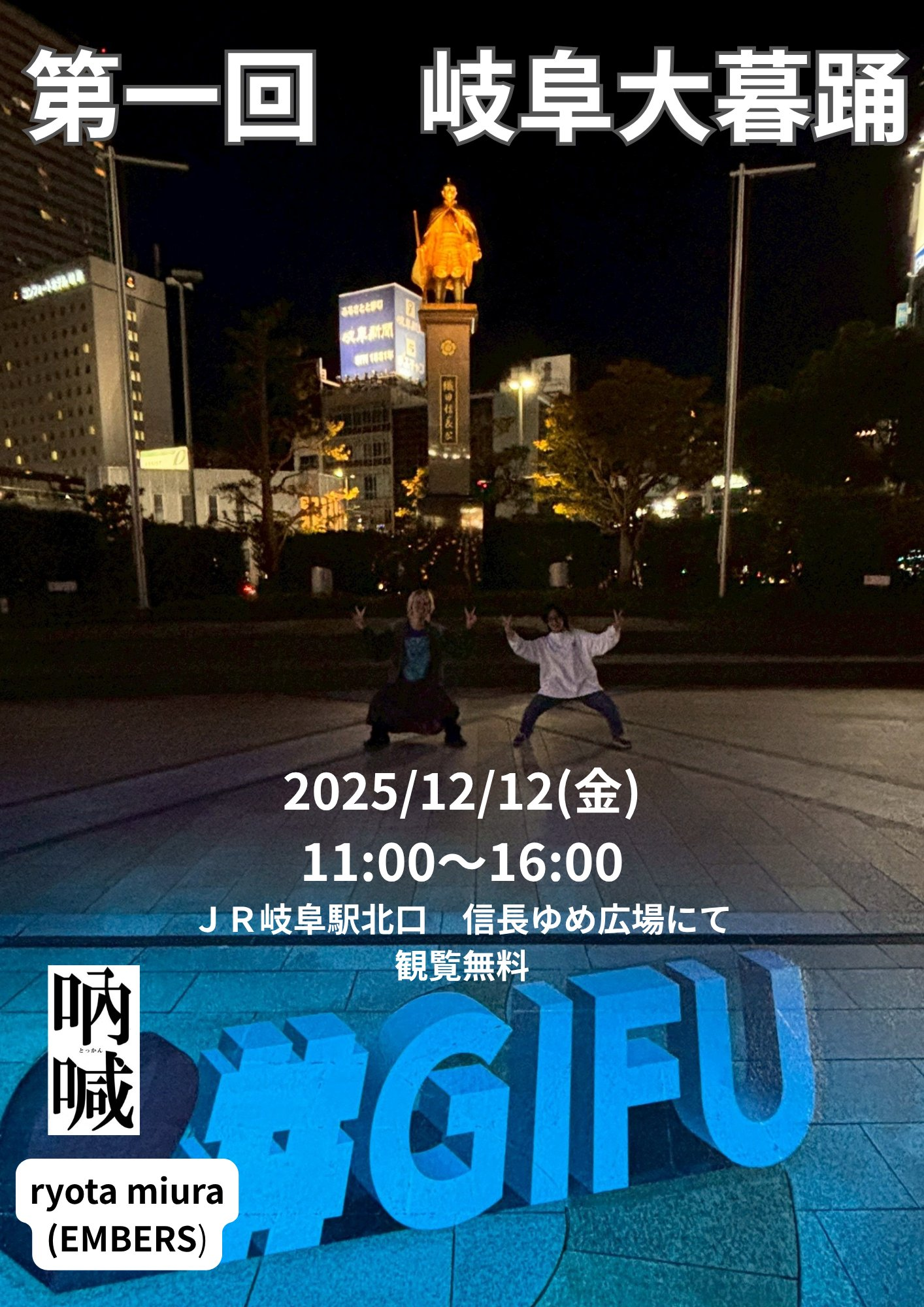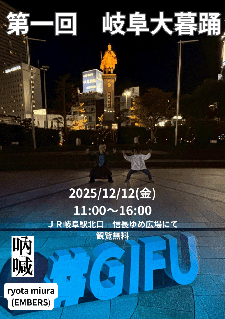 2025.12.12.Fri_11:00__岐阜大暮踊@岐阜県信長ゆめ広場 スケジュール 2025.11.082025.12.12 イベント名:岐阜大暮踊日付:2025/12/12(金)とき:11:00〜16:00場所:JR岐阜駅北口 信長ゆめ広場費用:無料