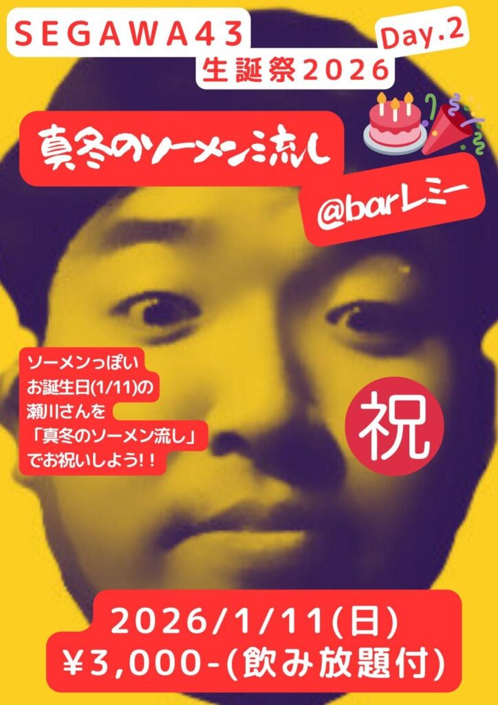 [素麺パーティー]2026.1.11.sun_??:??__SEGAWA43 生誕祭2026 DAY.2〜真冬のソーメン流し〜@鹿児島天文館barレミー